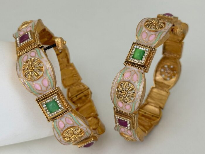 Beautifully crafted from high-quality brass, these traditional bangles feature intricate detailing, ruby-colored stones, and delicate faux pearls. With an antique gold finish and classic temple-style design, they’re perfect for weddings, festivals, and ethnic wear.
